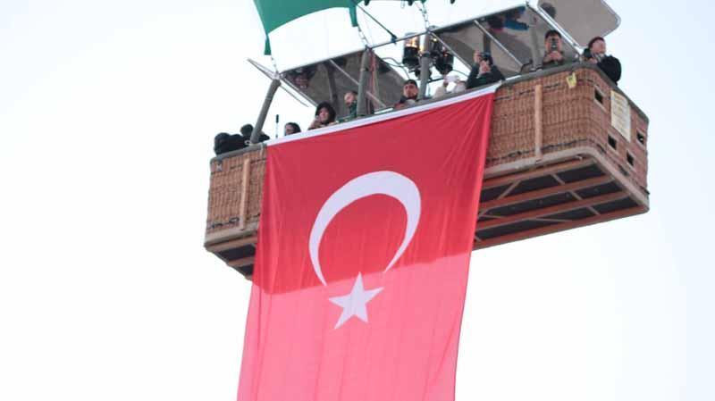 Nevşehir’deki turizm sektörü, Cumhuriyet Bayramı dolayısıyla sıcak hava balonlarını Türk bayraklarıyla süsledi. Balonların sepetlerine ayrıca Mustafa Kemal Atatürk’ün posterleri ve fotoğrafları asıldı. Bu bayraklarla donatılmış balonlar, Kapadokya’nın peribacaları, tüf kayalara oyulmuş yapılar ve yer altı şehirleri ile birleşerek göz alıcı manzaralar sundu.