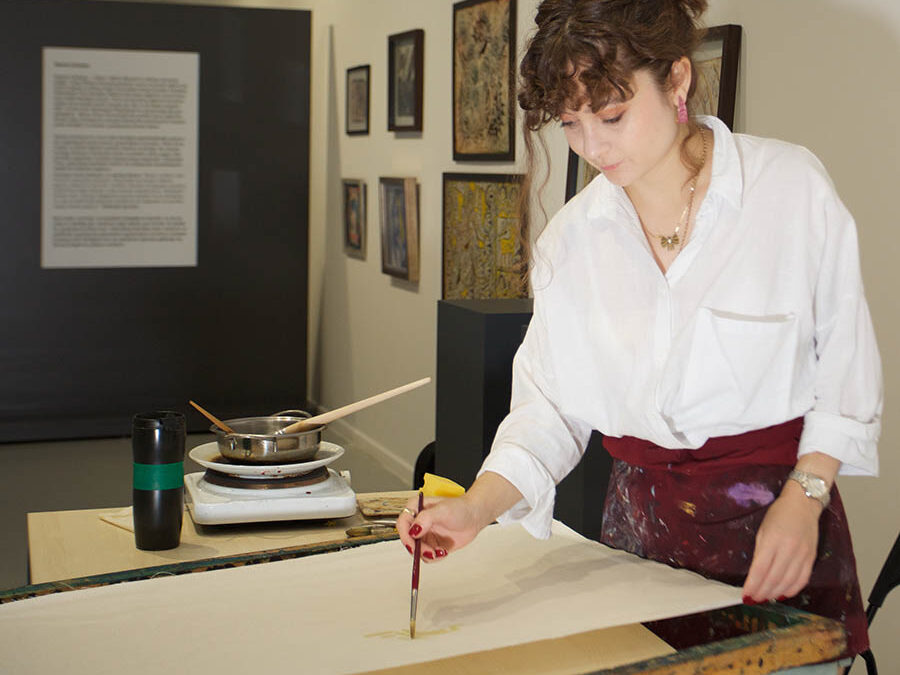 Bu eserlerimi yaratırken kullandığım mum batik tekniği, köklü bir geçmişe sahip geleneksel bir yöntemdir. Kumaşın yüzeyine erimiş mumla desenler çizerek, farklı katmanlarda boyama ve mumlama işlemleri yapıyorum. Her katmanda yeni bir hikâye ekleniyor ve son aşamada mum eritilerek kumaşın tüm zenginliği ortaya çıkarılıyor. Bu teknik, bana hem sabırlı olmayı hem de sürecin her anından keyif almayı öğretiyor.