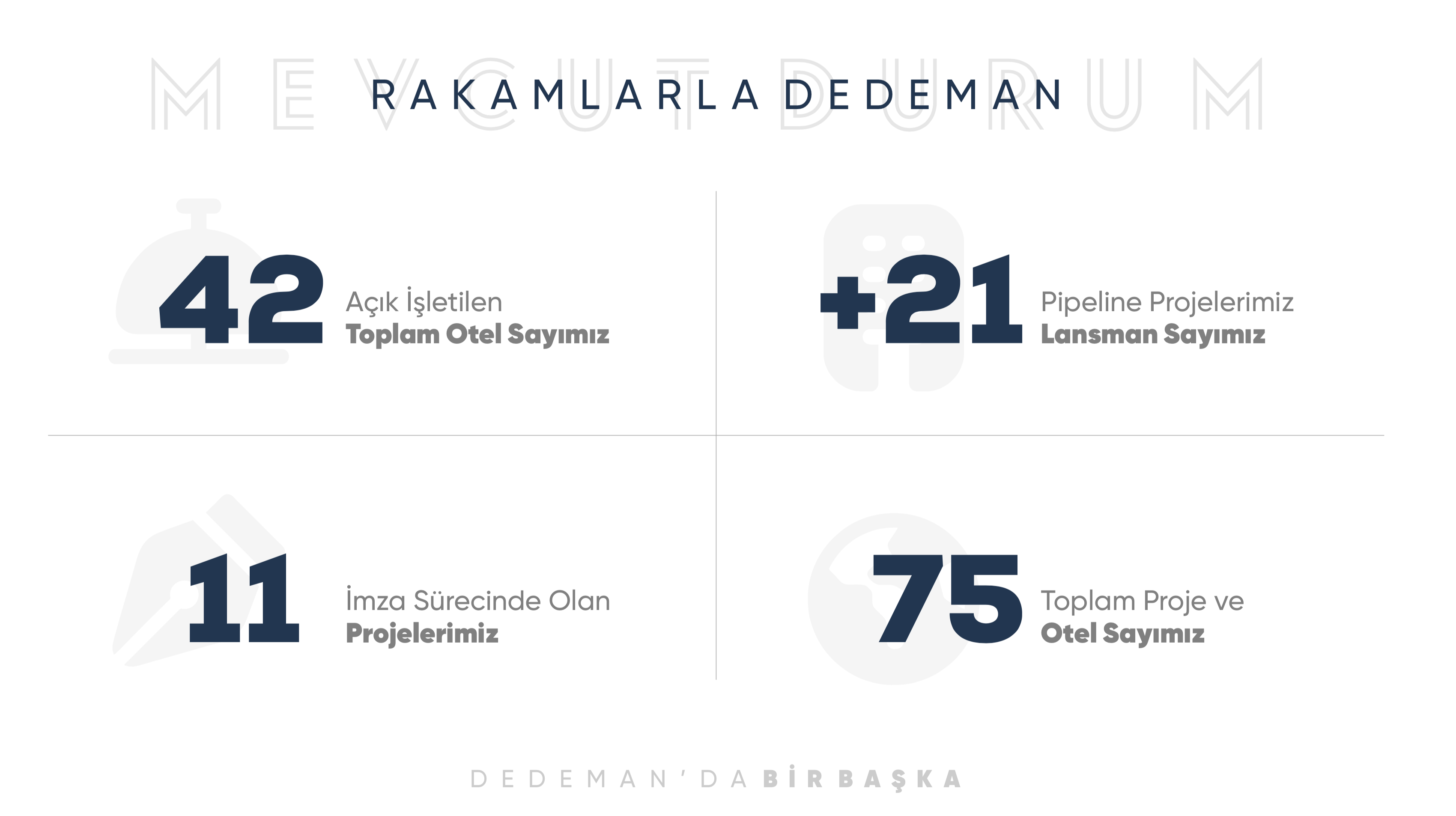 Türkiye turizminin öncü markalarından biri olarak Dedeman kalite ve marka standartlarının en değişmez konuların başında geldiğini belirten DHRI Yönetim Kurulu Başkanı Ergün Demiray, 58 yıllık Dedeman değerleri, kalitesi ve misafirperverliğinin tüm otellerimizde deneyimlenmesi olmazsa olmamız. Sağlıklı ve kontrollü büyüme yolculuğumuzda bu standartlarımıza uymayan otellerimize yaptırımlarımız olacak. Dedeman standartlarından ve misafirperverliğinden asla taviz vermeyeceğiz” dedi.