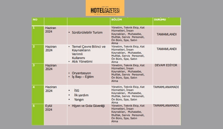 Otelin, sürdürülebilirlik sertifikası alabilmek için yerine getirmesi gereken temel kriterlerden biri olan yangın eğitiminin tamamlanmadığı ortaya çıktı. Otelin resmi internet sitesinde yer alan bilgilere göre, Haziran 2024’te planlanan iş sağlığı ve güvenliği, ilk yardım ve yangın eğitimi, yönetim, teknik ekip, kat hizmetleri, insan kaynakları, muhasebe, mutfak, servis personeli, ön büro, spa ve satın alma departmanlarına verilmesi gerekirken, bu eğitimlerin tamamlanamadığı açıkça belirtiliyor.