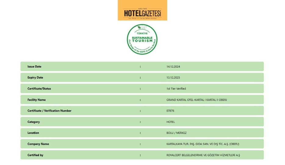 Grand Kartal Otel’in, Kültür ve Turizm Bakanlığı’na bağlı Türkiye Turizm Tanıtım ve Geliştirme Ajansı’ndan (TGA) “Sürdürülebilir Turizm Programı Sertifikası” aldığı belirlendi. TGA’nın yöneticileri arasında yer alan Halit Ergün’ün sahibi olduğu otel, Mart ve Aralık 2024 tarihlerinde iki farklı sertifikasyon firmasından bu belgeleri aldı. FQC Global Sertifikasyon A.Ş. tarafından 2 Mart 2024’te verilen ilk sertifikayı, 14 Aralık 2024 tarihinde RoyalCert Belgelendirme ve Gözetim Hizmetleri A.Ş.’nin verdiği ikinci sertifika izledi. Ancak, bu sertifikaların nasıl verildiği kamuoyunda ciddi soru işaretlerine neden oldu.
