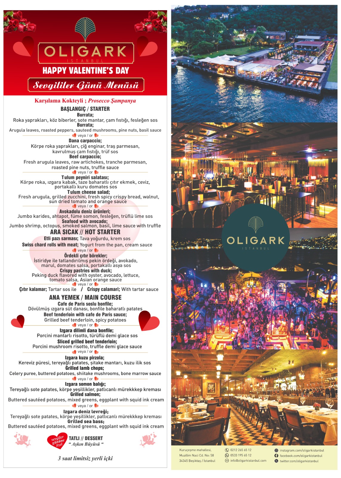 İstanbul’un en seçkin mekânlarından biri olan Oligark İstanbul, Sevgililer Günü’ne özel olarak hazırladığı muhteşem menüsü ve büyüleyici atmosferiyle çiftlere romantik bir gece sunuyor. Boğaz’ın ışıkları altında, denize sıfır konumuyla göz kamaştıran Oligark, eşsiz lezzetleri ve canlı müzikleriyle aşk dolu bir akşam vaat ediyor.