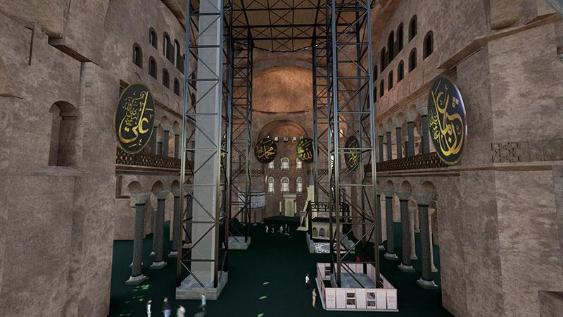 İç yüzeyde yürütülecek konservasyon, restorasyon ve güçlendirme işlemleri için 43,5 metre yüksekliğinde, dört ana kolona oturan bir çelik platform sistemi kurulacaktır. Böylelikle ibadetler kesintisiz bir şekilde devam ederken, kubbenin iç ve dış yüzeylerindeki uygulamalar da düzenli olarak sürdürülmüş olacaktır. Tüm bu işlemlerin güvenli ve hızlı bir biçimde gerçekleştirilebilmesi için doğu yönünde, 41 metre yüksekliğinde ve 60 metre bom uzunluğuna sahip bir kule vinç tasarlanmıştır. Bu vinç, yapıya uygun bir mesafede ve güvenli dönüş alanı sağlayacak şekilde inşa edilmiştir.