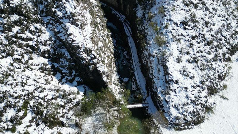 Bartın’ın Ulus ilçesinde yer alan Ulukaya Kanyonu ve Şelalesi, nisan ayı boyunca karla kaplanarak görsel bir şölen sundu. “Aşk acısını dindiren şelale” olarak bilinen bu alanın eşsiz manzarası, havadan dron ile kaydedildi.