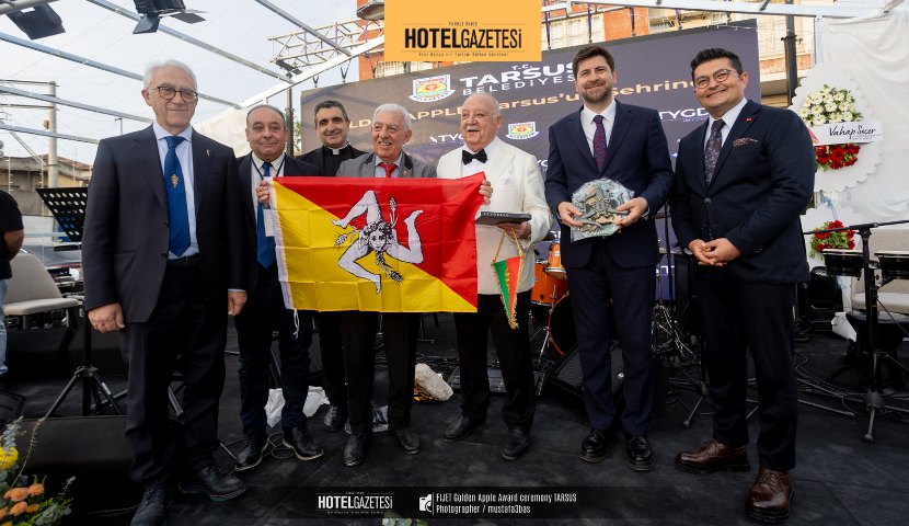 Saint Paul Meydanı’nda düzenlenen ödül töreninde Altın Elma, FIJET Başkanı Tijani Haddad tarafından Tarsus Belediye Başkanı Ali Boltaç’a takdim edildi.