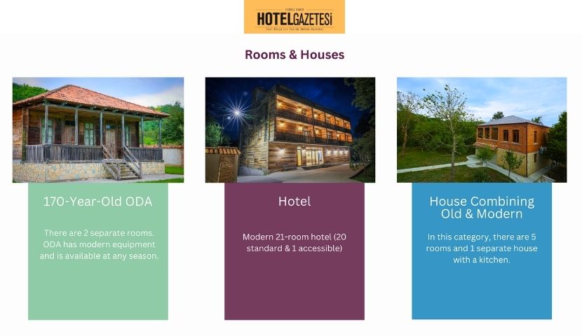 Ethno Sazano, 170 yıllık geleneksel Gürcü “ODA” evini modern tasarımla buluşturarak konuklarına otantik bir atmosfer sunuyor. 2023 yılında tamamlanan ana binada yer alan 21 odanın yanı sıra, bungalovlar ve özel evlerle birlikte toplam konaklama kapasitesi 30 oda. Her biri özgün detaylarla dekore edilen bu alanlar, geleneksel dokuyu modern lüksle harmanlıyor.