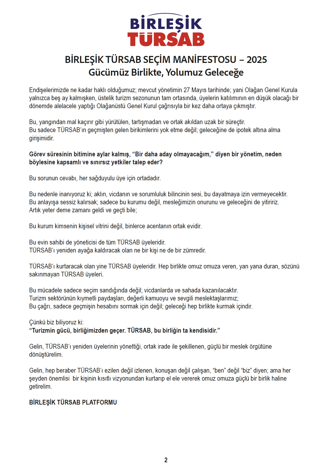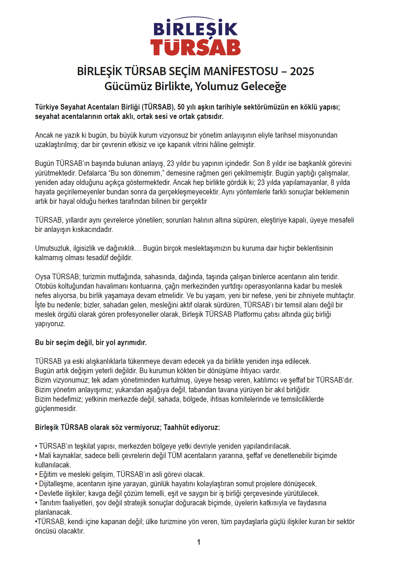 Birleşik TÜRSAB 2025 Seçim Manifestosu – Tam Metin