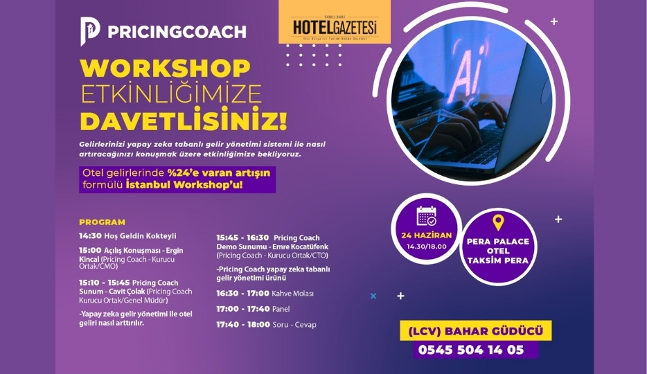 24 Haziran Salı günü Pera Palace Hotel’de düzenlenecek olan workshop, yapay zekâ destekli gelir yönetimi sistemlerinin otelcilikte nasıl kullanılabileceğine dair kapsamlı bir içerik sunacak. Katılımın ücretsiz olduğu etkinlik, İstanbul ve çevre illerde faaliyet gösteren otel yöneticileri, genel müdürler, satış ve pazarlama ekipleri ile gelir yönetimi profesyonelleri için özel olarak tasarlandı.