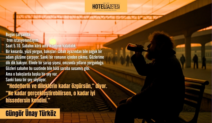 Bugün çarşamba. Tiflis tren istasyonundayım. Saat 5.10. Sabahın körü ama istasyon kalabalık. Bir kenarda, yüzü yorgun, bakışları sabah ayazından bile soğuk bir adam gözüme çarpıyor. Sanki bir romanın içinden çıkmış. Gözlerime dik dik bakıyor. Elinde bir şarap şişesi, omzunda yılların yorgunluğu. Gözleri sabahın bu saatinde bile hâlâ şaraba susamış gibi. Ama o bakışlarda başka bir şey var. Sanki bana bir şey söylüyor. “Hedeflerin ve dileklerin kadar özgürsün,” diyor. “Ne kadar gerçekleştirebilirsen, o kadar iyi hissedersin kendini.” Onun o hırpani, berduş haline bir an için özeniyorum. Öylece oturmuş, sabahın ayazında, hiçbir yere yetişme derdi yok gibi… Keşke, diyorum içimden, keşke ben de onun gibi olsaydım. Bu saçma düşünce sabahın serinliği gibi geçiyor içimden, ürpertiyor ama sonra hemen kayboluyor.
