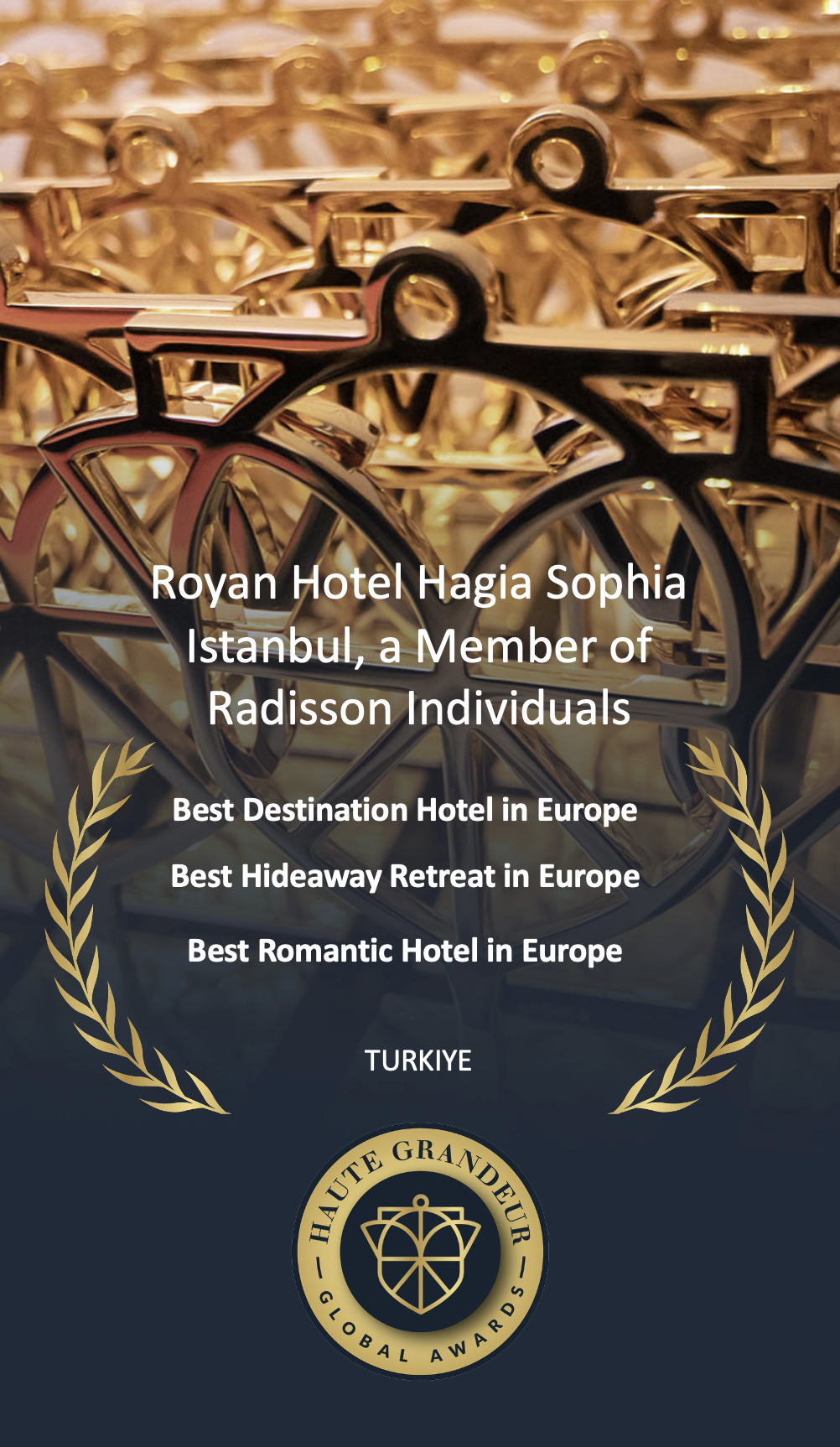 Royan Hotel Hagia Sophia Istanbul, a member of Radisson Individuals, dünyanın en prestijli konaklama ödüllerinden Haute Grandeur Global Awards 2025’te dört ayrı kategoride ödül kazanarak büyük bir başarıya imza attı. Otel, “Avrupa’nın En İyi Destinasyon Oteli”, “En İyi Saklı Kaçış Noktası”, “En İyi Yeni Otel” ve “En Romantik Otel” unvanlarına layık görüldü.