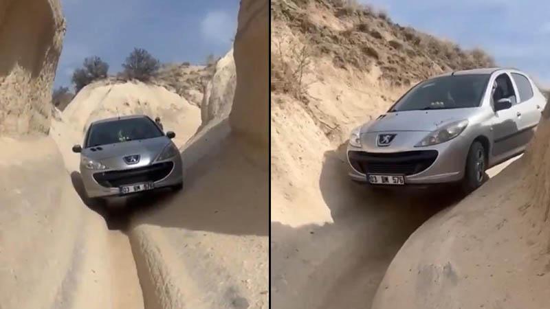 Kapadokya, Türkiye’nin en popüler turizm merkezlerinden biri olarak dikkat çekmeye devam ediyor. Ancak, burayı ziyarete gelen bir sürücü, navigasyon cihazının hatalı yönlendirmesi nedeniyle trafiğe kapalı bir yola girdi. Kayalıklar arasında ilerleyen sürücünün yaşadığı ilginç anlar, cep telefonuyla kaydedildi ve bu görüntüler sosyal medya platformlarında büyük yankı uyandırdı.