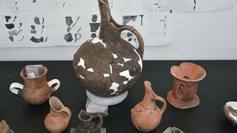 “Elde yapılmış çanak çömlekler arasında, çeşitli boyutlarda testiler ve testicikler bulduk. Testilerin ağız kısımları, hayvan figürlerini temsil eden ördek şeklinde bir gaga formuna sahiptir. Bu kapların çoğu sıvı taşıma amacıyla kullanılmış. Ayrıca, ‘tankart’ olarak adlandırılan iki kulplu maşrapa tarzında bir kap da keşfedilmiştir. Kaplar arasında en dikkat çekici keşif ise bir ritüel kabıdır. İki ayrı kap, bir araya getirilerek tek bir kap şeklini almıştır. Bu kap, yiyecek veya içecek sunumu için değil, törenlerde özel sıvıların dökülmesi amacıyla tasarlanmış olup, kadın ve erkeği temsil edebileceği düşünülmektedir. Üzerindeki desen çizgileri beyaz boya ile doldurulmuş durumdadır. Aynı zamanda bu eserlerde tekstilin kullanımı hakkında da bilgi edinmek mümkündür.”