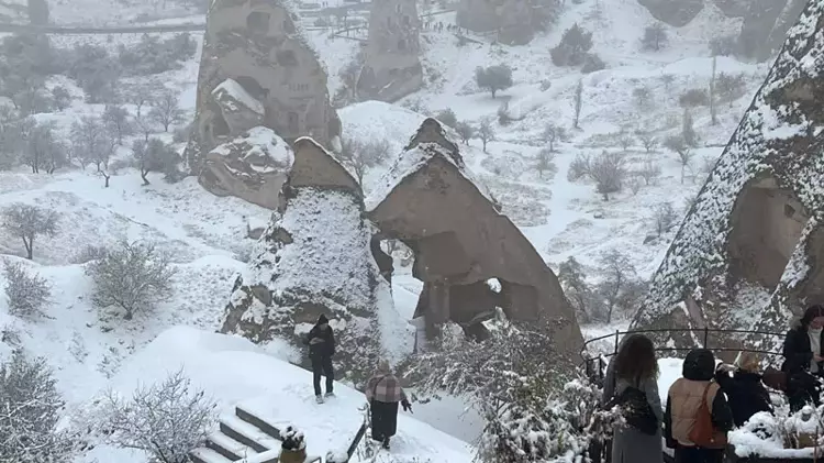 Kapadokya’da mevsim normallerinin altında seyreden hava sıcaklıkları, fırtına ve sağanak yağışların ardından kar yağışıyla birlikte değişti. Bu durum, bölgedeki ünlü peribacalarını beyaz bir örtüyle kaplarken, Göreme, Ürgüp, Zelve ve Uçhisar gibi popüler turistik alanlarda ziyaretçiler kar yağışının tadını çıkardı.