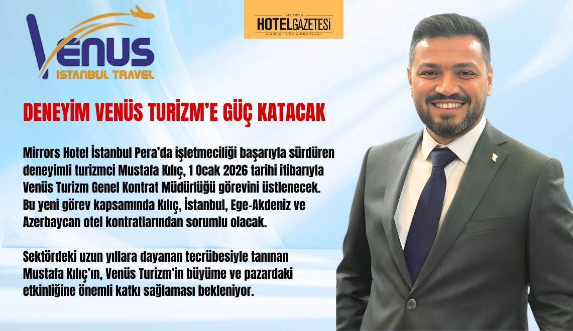 Mirrors Hotel İstanbul Pera’da işletmeciliği başarıyla sürdüren deneyimli turizmci Mustafa Kılıç, 1 Ocak 2026 tarihi itibarıyla Venüs Turizm Genel Kontrat Müdürlüğü görevini üstlenecek. Bu yeni görev kapsamında Kılıç, İstanbul, Ege-Akdeniz ve Azerbaycan otel kontratlarından sorumlu olacak.