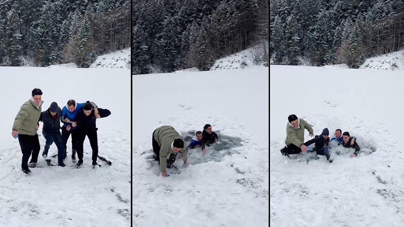 İnşaat mühendisi Berat Küskün, kıyıdan uzaklaştıklarını fark etmediklerini belirterek, “Gölün buz kaplı olduğunu görünce fotoğraf çekmek için gittik. Ayağımdaki çizmelere güvenerek, arkadaşımın bize video çekmesini istedim. Tarık’ın koluna girdim ve kıyıda olduğumuzu düşündüğümüz için buz üzerinde atladık. Diğer arkadaşlarımız da katılınca fazla ağırlığa ulaştık. Kıyıdan uzaklaştığımızın farkında değildik. Buz kırıldığında ise güzel görüntüler ortaya çıktı. İzleyenleri güldürebildiysek ne mutlu bize” şeklinde konuştu.