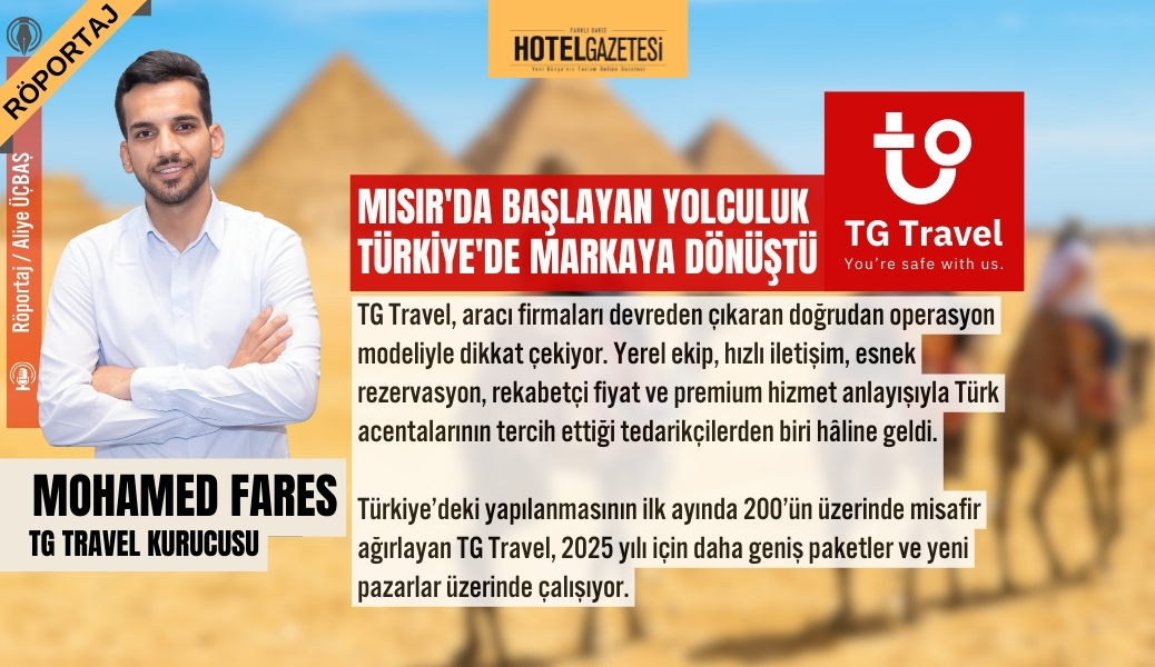 Mohamed Fares:Turizm yolculuğum Mısır’da başladı. Türk turist sayısının yükseldiği ilk yıllarda acentalara otel, ulaşım, rehber ve ekstra turlar dâhil tüm şehirlerde yerel hizmet sağlıyordum. Zamanla büyümenin Türkiye’ye daha yakın durmakla mümkün olduğunu gördüm. Bu nedenle Türkiye’ye geldim ve TG Travel’ı kurdum. Bugün iki ülkede aktif bir yapıyla, Mısır ve Türkiye arasında güçlü bir köprü oluşturuyoruz.