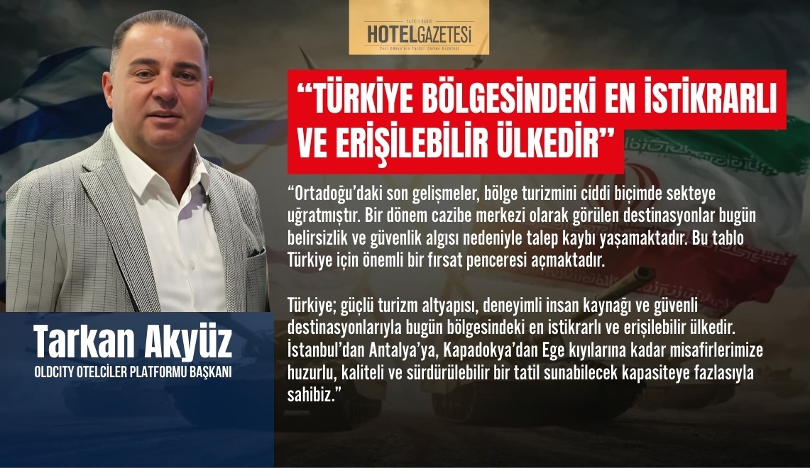 Ortadoğu’da son dönemde yaşanan gelişmelerin bölge turizmini ciddi biçimde sekteye uğrattığına dikkat çeken Oldcity Otelciler Platformu Başkanı Tarkan Akyüz, kamuoyuna yaptığı açıklamada Türkiye için önemli bir fırsat penceresi doğduğunu vurguladı. Güvenlik algısındaki zayıflama ve artan belirsizlikler nedeniyle bir dönem cazibe merkezi olarak görülen destinasyonların talep kaybı yaşadığını belirten Akyüz, bu sürecin doğru stratejiyle Türkiye lehine çevrilebileceğini ifade etti.
