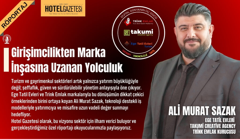 Turizm ve gayrimenkul sektörleri artık yalnızca yatırım büyüklüğüyle değil; şeffaflık, güven ve sürdürülebilir yönetim anlayışıyla öne çıkıyor. Ege Tatil Evleri ve Trink Emlak markalarıyla bu dönüşümün dikkat çekici örneklerinden birini ortaya koyan Ali Murat Sazak, teknoloji destekli iş modelleriyle yatırımcıya ve misafire uzun vadeli değer sunmayı hedefliyor. Hotel Gazetesi olarak, bu vizyonu sektör için ilham verici buluyor ve gerçekleştirdiğimiz özel röportajı okuyucularımızla paylaşıyoruz.