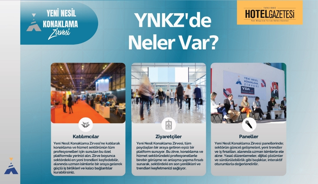 Turizm ve konaklama sektörünün dönüşümüne yön veren lider isimler, yatırımcılar ve markalar Yeni Nesil Konaklama Zirvesi (YNKZ) kapsamında bir araya geliyor. Sektörün geleceğini şekillendirecek trendler, sürdürülebilirlik vizyonu, dijitalleşme, yeni nesil misafir deneyimi ve yatırım fırsatları bu özel platformda ele alınacak.