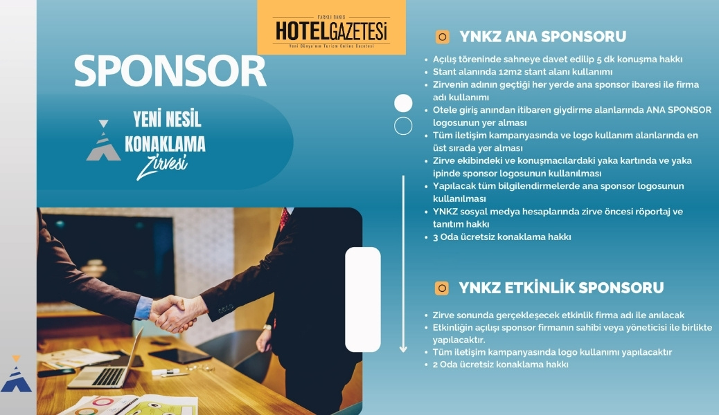 Yeni Nesil Konaklama Zirvesi, sektör profesyonellerine hem katılımcı hem de sponsor olarak yer alma fırsatı sunuyor. Zirve kapsamında ana sponsor, etkinlik sponsoru, oturum sponsoru, dış alan giydirme sponsoru ve destek sponsoru gibi farklı sponsorluk kategorileri bulunuyor.