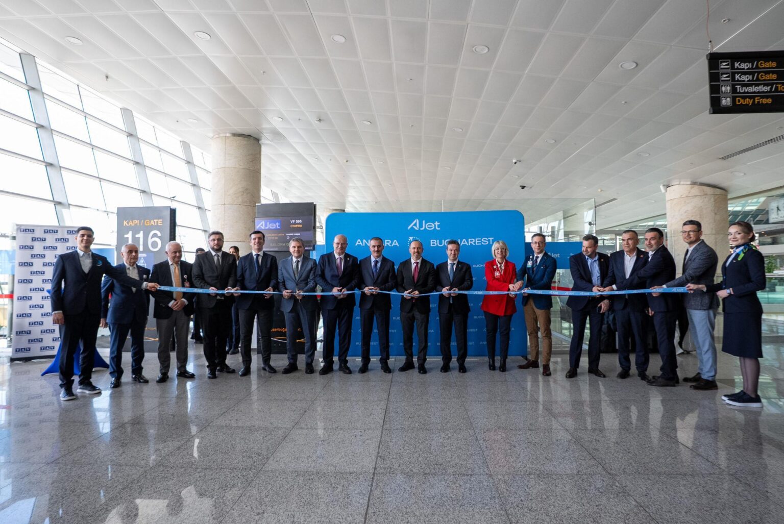 Tören, Ankara Esenboğa Havalimanı’nda gerçekleştirildi. Havalimanında yapılan kurdele kesiminin ardından Türkiye Cumhuriyeti Bükreş Büyükelçisi Özgür Kıvanç Altan, AJet Genel Müdürü Kerem Sarp, Gürsel Baran ve AJet ile havalimanı üst yönetimi uçağa bindi. Boeing 737-8 MAX tipi uçak, VF595 sefer sayılı ilk uçuş için hazırlandı. Uçuş öncesinde yolculara lokum ikram edilirken, Kerem Sarp yolcularla sohbet etti ve hatıra hediyeleri dağıttı. Törenin ikinci kısmı Romanya’da devam etti. Yaklaşık 1,5 saat süren uçuşun ardından uçak, Henri Coanda Uluslararası Havalimanı’na yolcuların alkışları eşliğinde iniş yaptı ve geleneksel su takı ile karşılandı. Burada bir basın toplantısı ve karşılama töreni düzenlendi.