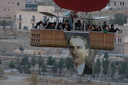Kapadokya'da sabahın erken saatlerinde havalanan sıcak hava balonlarının sepetlerine, Türkiye Cumhuriyeti'nin kurucusu…